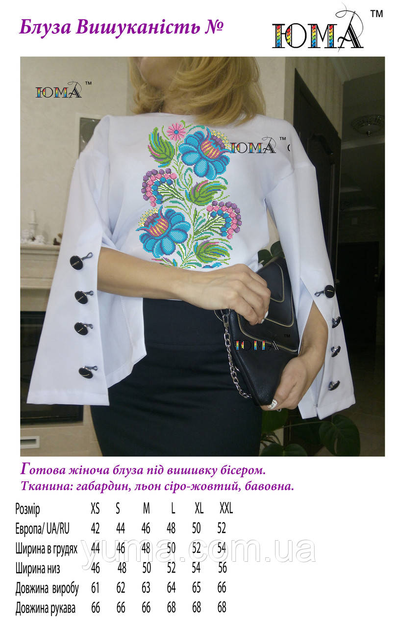 Пошита блуза з нанесеним малюнком для вишивання бісером. Пошиття блузи здійснюється на трьох тканинах, білий габардин, сіро-жовтий льон і білий бавовна. Блуза укомплектована гудзиками. Ціна вказана за льон і бавовна.