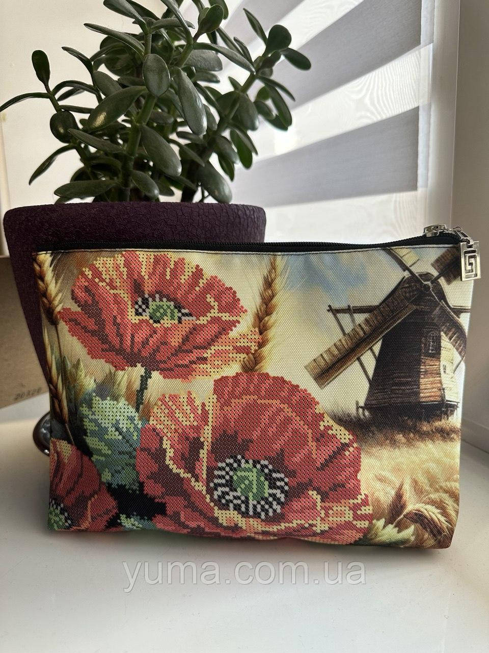 Косметичка з нанесеною схемою для вишивки бісером, зшита з міцної наметової тканини (Оксфорд), водонепроникна, стійка до ультрафіолетового випромінювання, відносно легка і м'яка, стійка до механічних пошкоджень (стирання, відшаровування, розриву). Всередині є підкладка. Розмір 25 на 18 см, дно 4 см. Форма трапеція, застібка блискавка. Колір зворотної сторони може бути: беж, червоний, чорний або синій.  Данна модель може бути виготовленна у комплекті із сумкою та аналогічною схемою вишивки.